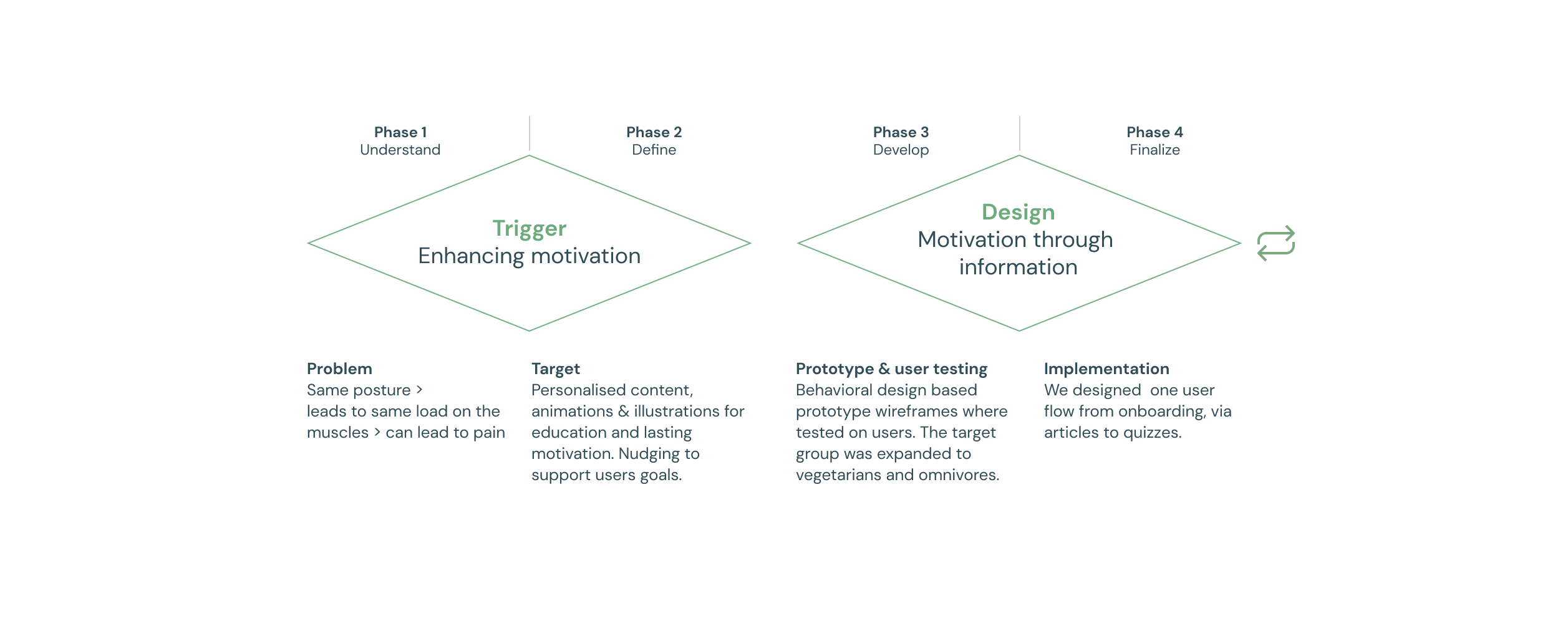 Personalized content tailored to users’ interests is the best way to encourage their engagement. For example, someone who is changing their diet for health reasons may not be interested in animal welfare news. We wanted to understand how we can motivate through design, so we looked at Behavioral Design and Nudging. Nudging means subtly directing people towards a certain direction without applying pressure or strong influence. We assume that our users are looking to change their diet with the app, so we want to actively support this goal without unconsciously influencing users.